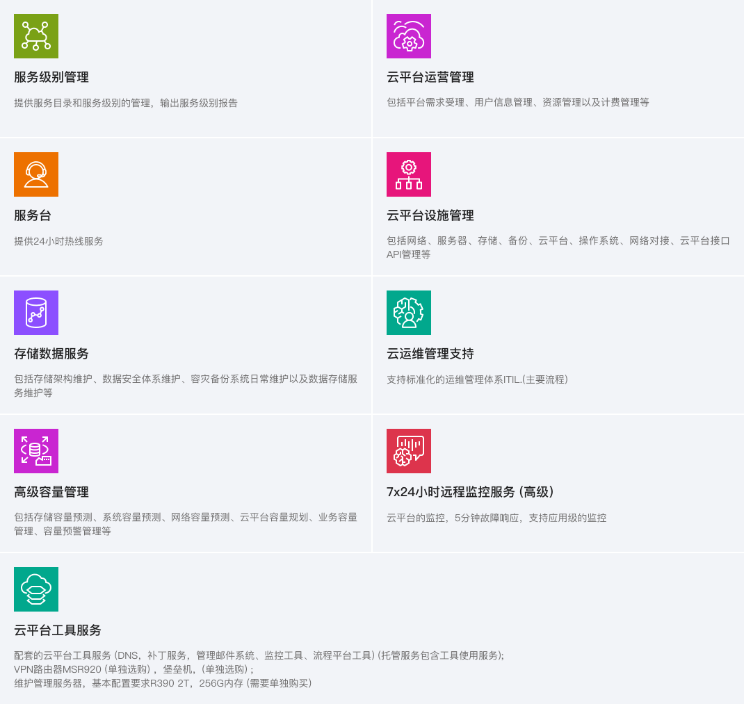 博思提供专业的云运维支撑团队,通过远程和现场服务相结合的方式,配套一系列标准化的云计算运维流程、管理体系和经过大量市场验证的可靠的工具平台,确保客户云基础设施和应用系统可正常、安全、高效、经济的运行,达到客户对云业务SLA的要求。