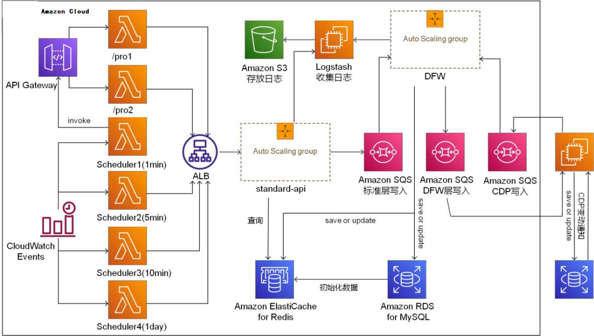 整体架构使用的亚马逊云科技服务包括Amazon Elastic Compute Cloud (Amazon EC2)、 Amazon Simple Storage Service (Amazon S3)、 Elastic Load Balancing、 Amazon Relational Database Service (Amazon RDS)、 Amazon ElastiCache、 Amazon Simple Queue Service (Amazon SQS)、 Amazon Lambda、 Amazon API Gateway、 Amazon CloudWatch